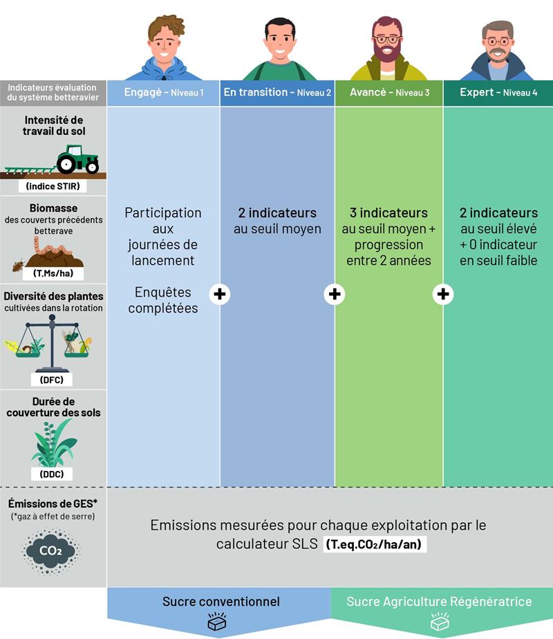 Le programme Agriculture Régénératrice distingue quatre niveaux pour les planteurs : Engagé, En transition, Avancé et Expert.