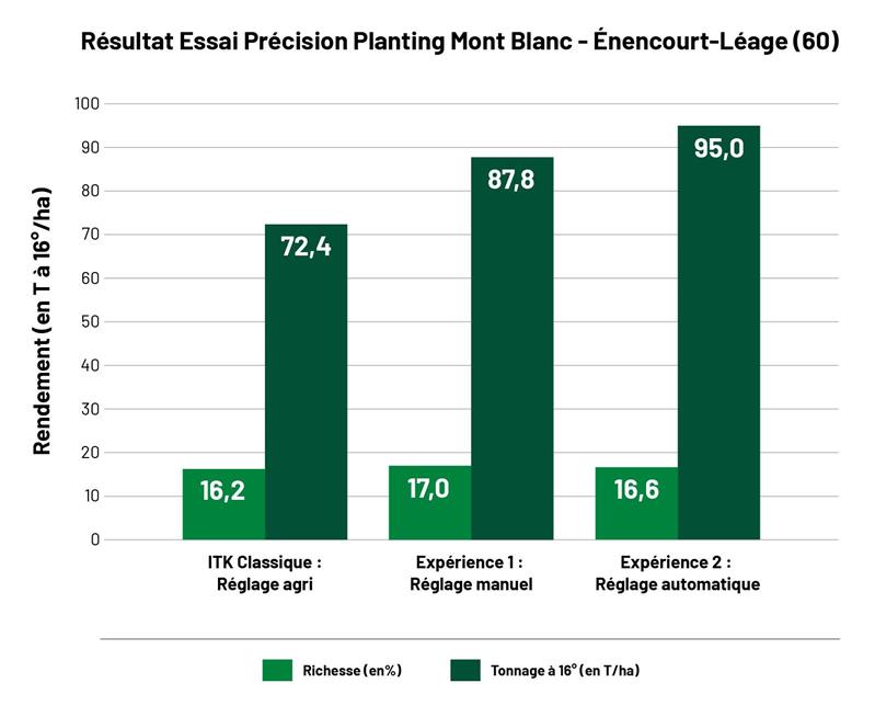 On observe une augmentation importante du rendement sur les modalités semées avec les équipements Precision Planting de + 20 % en réglage manuel et de + 30 % en réglage automatique.