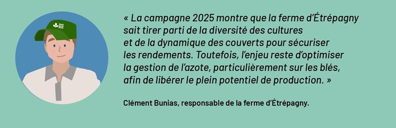 La ferme agroécologique Le 29/10/2025La saison estivale 2025 se termine sur un bilan contrasté pour la ferme agroécologique d’Étrépagny. Les rendements des cultures d’hiver sont globalement bons mais le plein potentiel n’est pas atteint en blé. En revanche, la féverole de printemps confirme pour la deuxième année consécutive de très bons résultats.