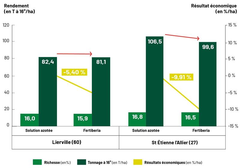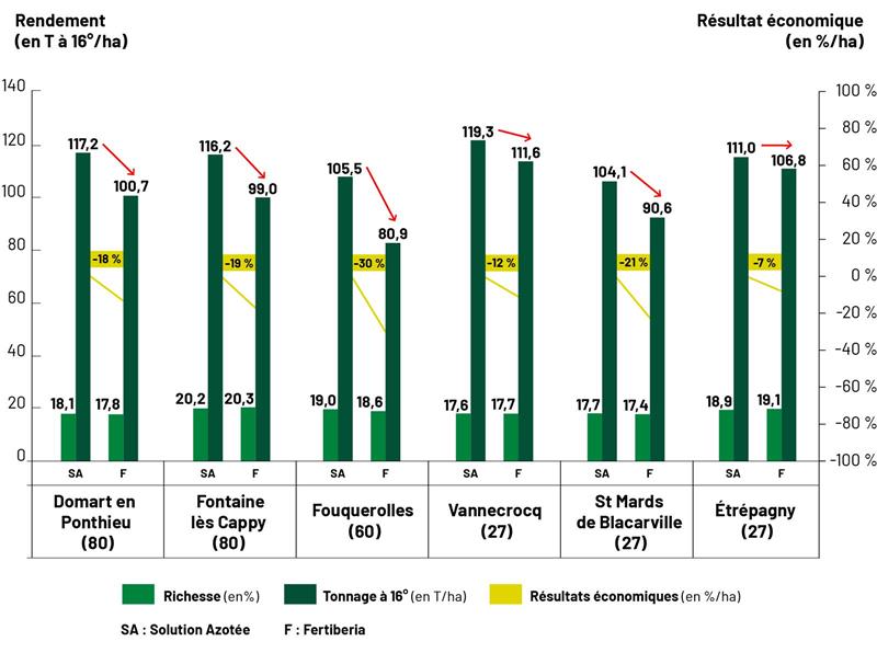 Ainsi, sur neuf sites fertilisés avec IZDS+ et comparés à la solution azotée 39 N, seuls trois d’entre eux présentent un gain de rendement. En moyenne, les six situations défavorables accusent une perte d’environ - 13,9 t/ha, quand les trois situations positives affichent un gain proche de + 10 t/ha. Le résultat moyen pour l’ensemble est de - 5,9 t/ha.